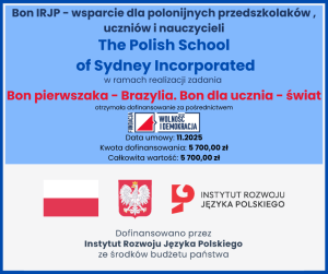 The Polish School of Sydney została dofinansowana w Konkursie 6 – Bon IRJP – wsparcie dla polonijnych przedszkolaków , uczniów i nauczycieli przez Instytut Rozwoju Języka Polskiego ze środków budżetu państwa, przez Fundacja Wolność i Demokracja. Opiekun- Barbara Czyżewska. Dzięki dofinansowaniu zostaną przyznane bony naukowe, zgodnie z wewnętrznym Regulaminem Szkoły.